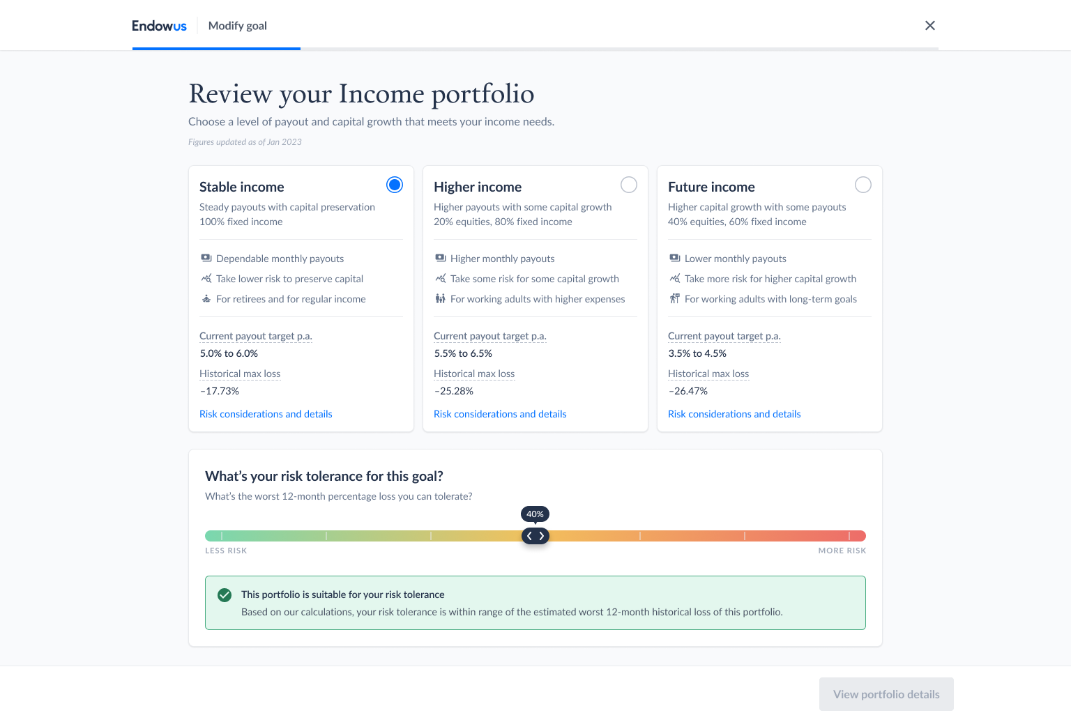 - Select the portfolio based on the level of payout and capital growth that suits your income needs