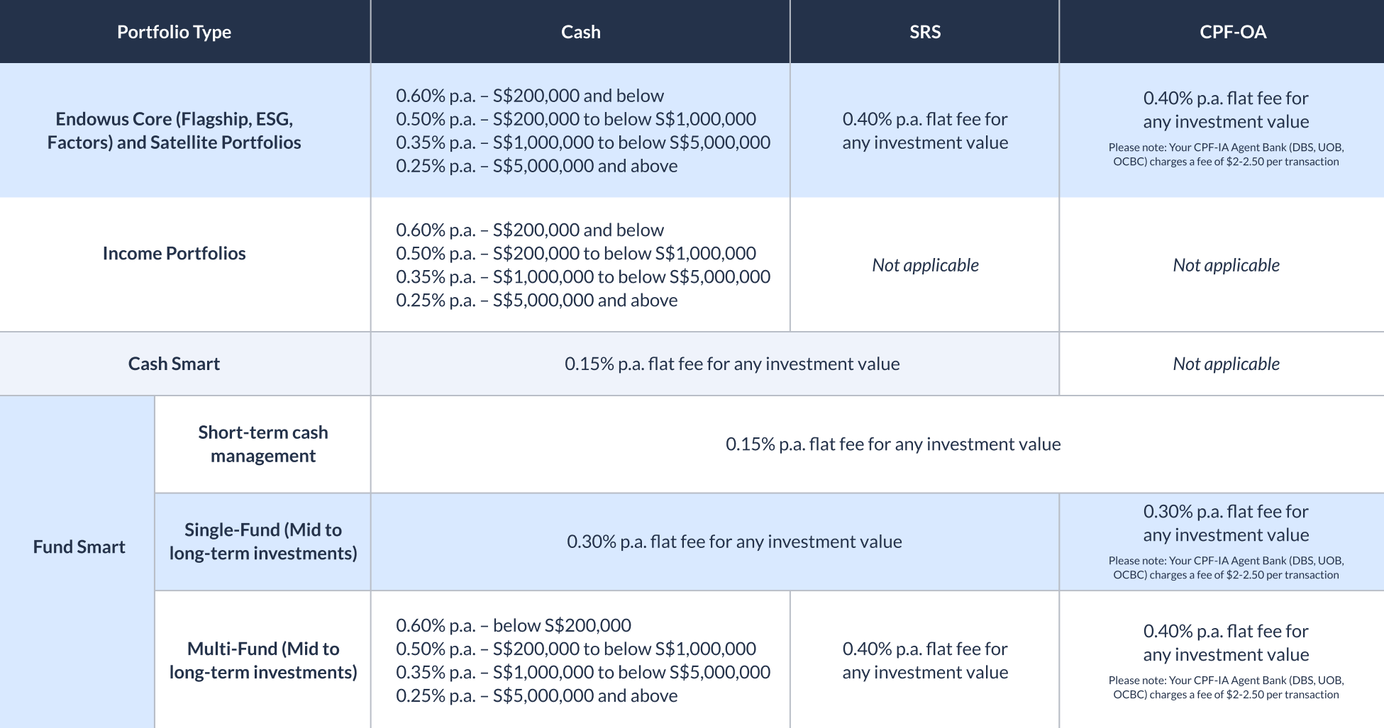 The Endowus Fee is paid to Endowus for all relevant advisory and investment services, product and platform access. Fees differ based on portfolio type and funding source (Cash/CPF-OA/SRS). The Endowus Fee p.a. is based on Assets under Advice (AUA).