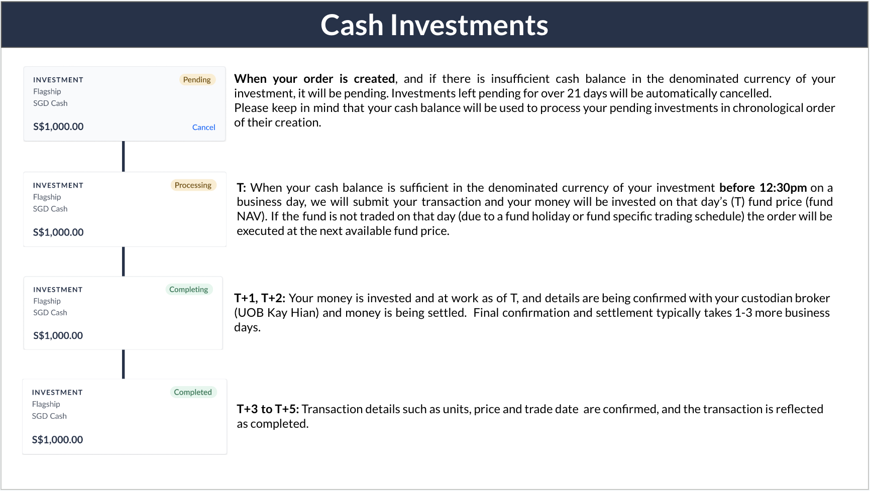 For cash investment orders confirmed before 12.30PM on a valid business day, we will endeavour to submit the orders to our partner broker UOB Kay Hian for execution on the same business day (T). You can assume that the transaction has taken place at the Fund's Net Asset Value ('trading price') of that day. The below is an estimated timeline of how cash investment orders will be executed: